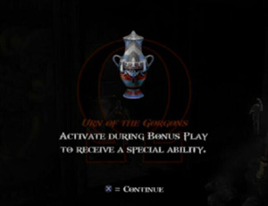 There are seven 'Urns of Power' that can be acquired in God of War II. Once an urn has been obtained, it can then be activated from the status menu during a bonus play game. To start a bonus play game, you must first complete God of War II. Afterwards, select 'New Game' from the main menu and you will be able to start a new game with all of your previous weapon and magic levels intact. Bonus play is only available for the difficulty level you completed the game on or a lower. So if you complete the Game in Normal Mode you can play the Bonus Play on Easy And Normal Mode , And You cann't collect any other Urns because the Urn was turned into Red Orbs .